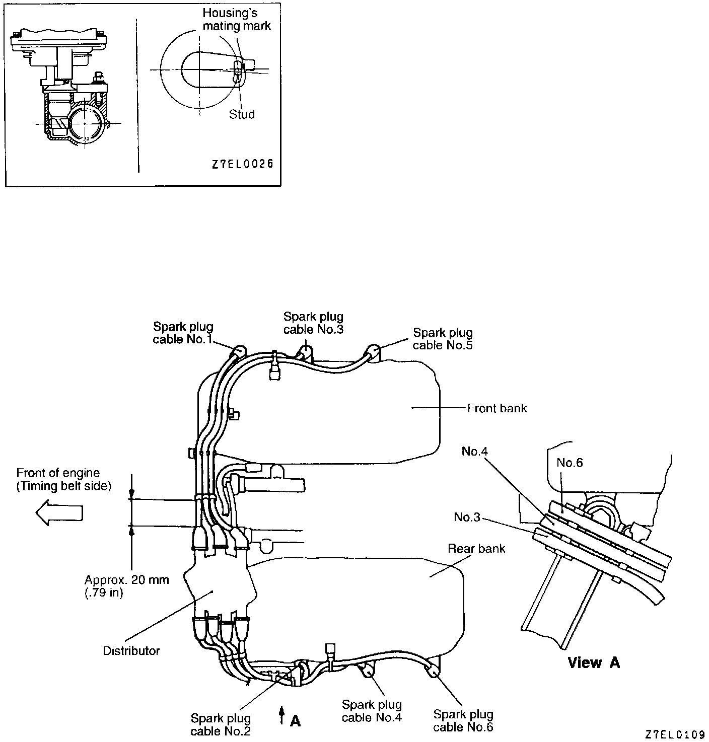 CAUTION: Improper arrangement of spark plug cables will induce voltage between the cables, causing miss firing and developing a surge at acceleration in high-speed operation. Therefore, be careful to arrange the spark plug cables properly by the following procedure.