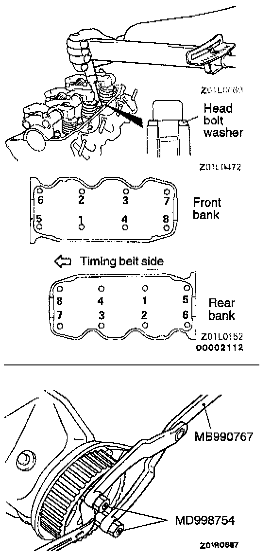 NOTE: Install the head bolt washers as shown with shear droop upward.