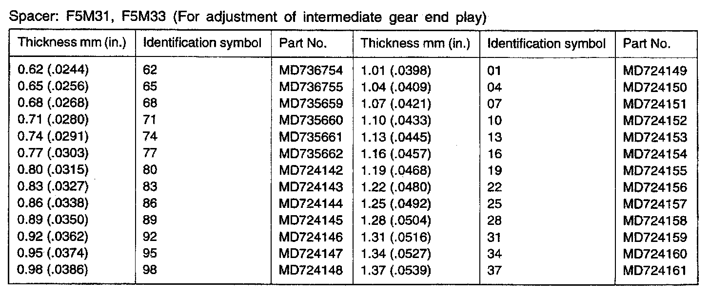 F5M31/F5M33 5-spd M/T, Intermediate Gear End Play: