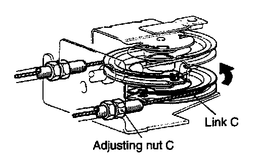 4. Rotate intermediate link C in the direction shown until it is blocked by the stopper, turn down adjusting nut C in the direction that the free travel of the inner cable is reduced, and back off adjusting nut C the specified number of turns just before intermediate link C begins to move.