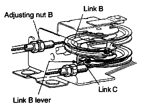 6. Turn down adjusting nut B in the direction that the free travel of the inner cable of the throttle cable is reduced. At the position where the lever of intermediate link B is brought into contact with intermediate link C, back off adjusting nut B the specified number of turns.