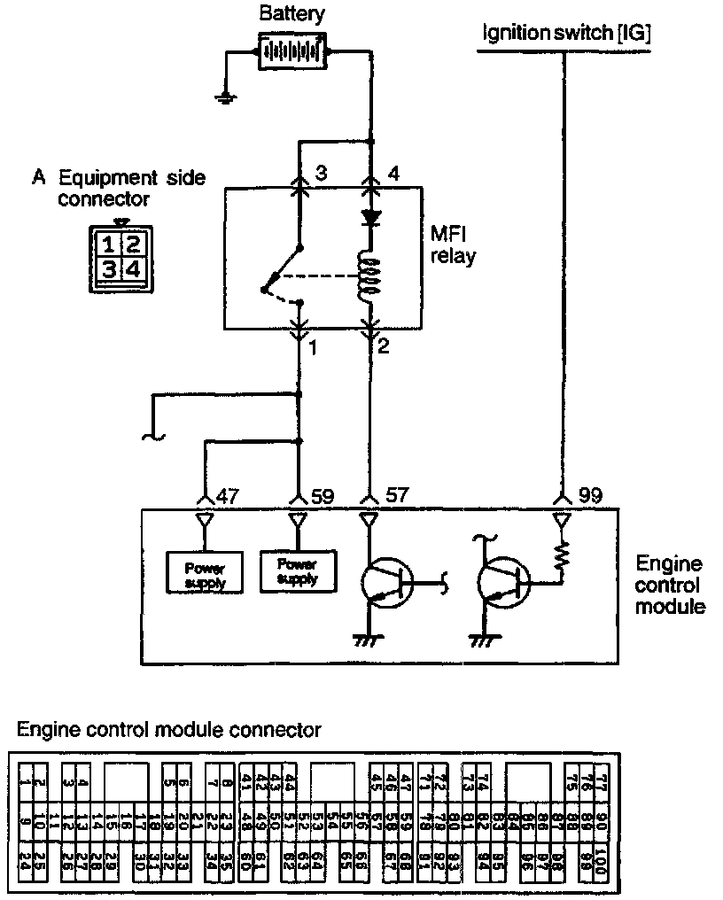 - When the ignition switch is turned on, the battery voltage is applied from the ignition switch to the engine control module, which then turns ON the power transistor to energize the MFI relay coil. This turns ON the MFI relay switch and the power is supplied from the battery to the engine control module through the MFI relay switch.