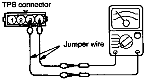b. Using jumper wires, connect an ohmmeter across terminal (3) (closed throttle position switch) and terminal (4) (sensor ground) of the throttle position sensor.