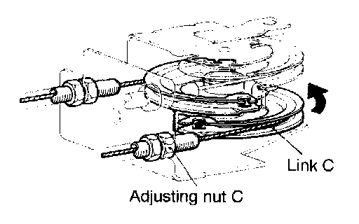 4. Rotate intermediate link C in the direction shown until it is blocked by the stopper, turn down adjusting nut C in the direction that the free travel of the inner cable is reduced, and back off adjusting nut C the specified number of turns just before intermediate link C begins to move.