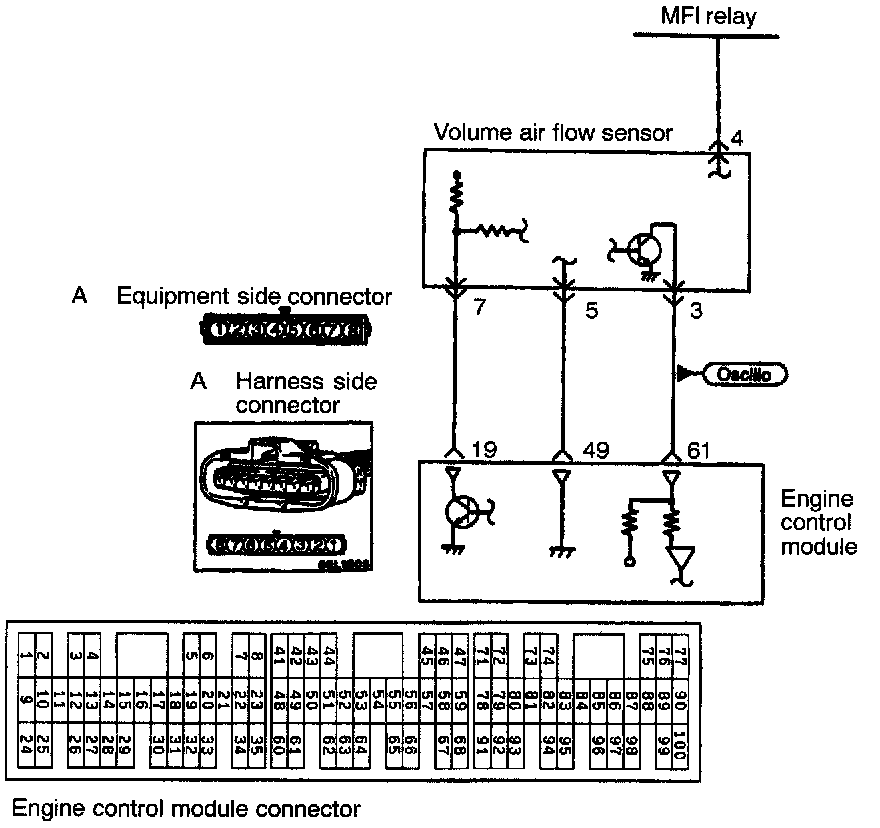 - The volume air flow sensor power is supplied from the MFI relay to the volume air flow sensor and is grounded in the engine control module. The volume air flow sensor generates a pulse signal as it repeatedly opens and closes between the 5 V voltage supplied from the engine control module and ground.