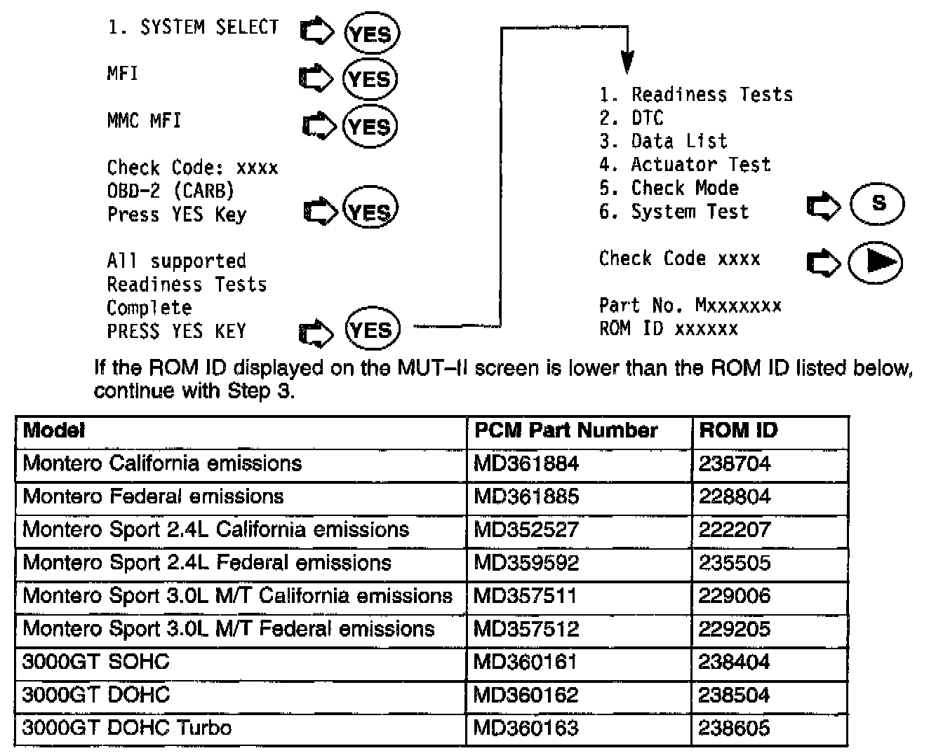 b. If there is not a label indicating that this TSB has already been completed, verify the PCM software level by either checking the vendor number on the PCM label, or by checking the ROM ID with the MUT-II scan tool.