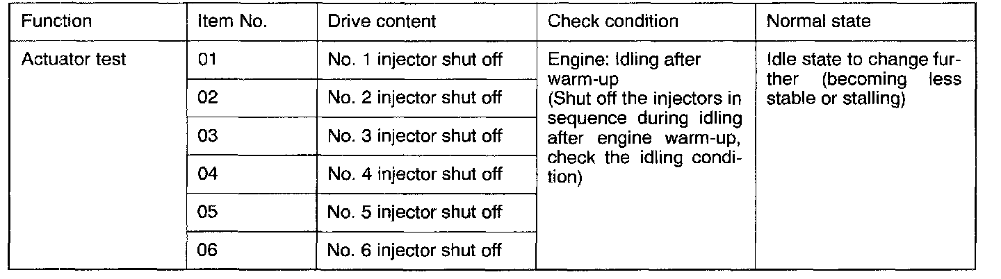 If there is any cylinder whose idle state remains unchanged when the fuel injection of injectors is cut one after another during idling, make following checks about such cylinder.