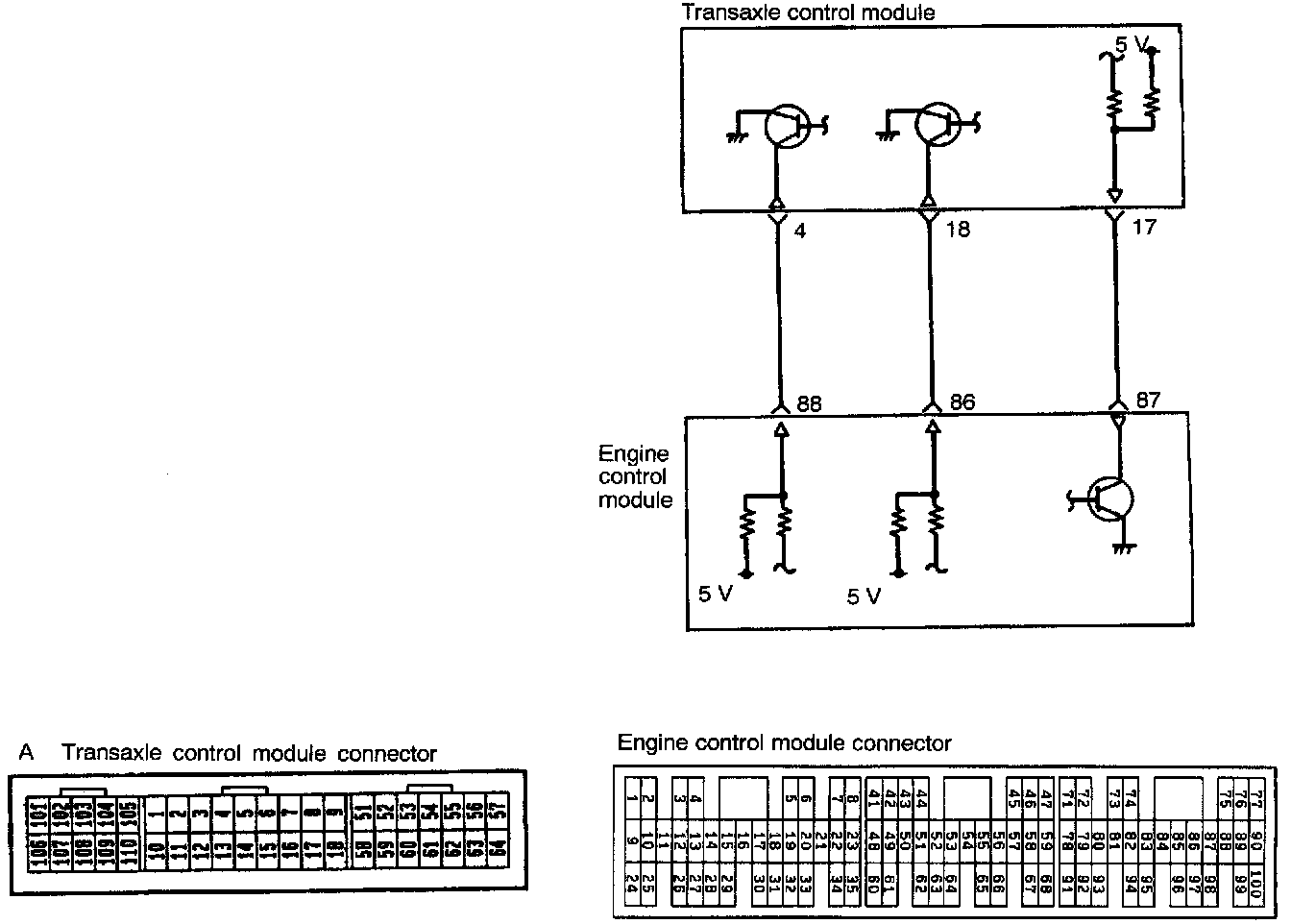 - If the transistor inside the engine control module changes from OFF to ON by the command of the engine control module, the terminal having a voltage of 5 V applied to it from the transaxle control module is grounded in the engine control module.