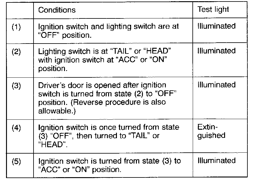 2. Keeping the connector connected to the light automatic shut-OFF unit, connect the test light (12 V - 3.4 W) from the harness side to terminal No.6 (for tail lights) or No.7 (for headlights). Under the following conditions, check the operation of the test light.