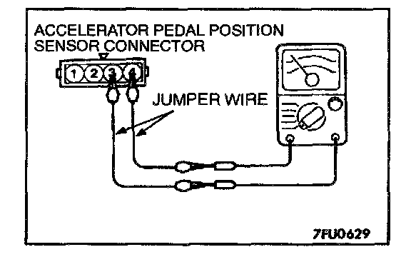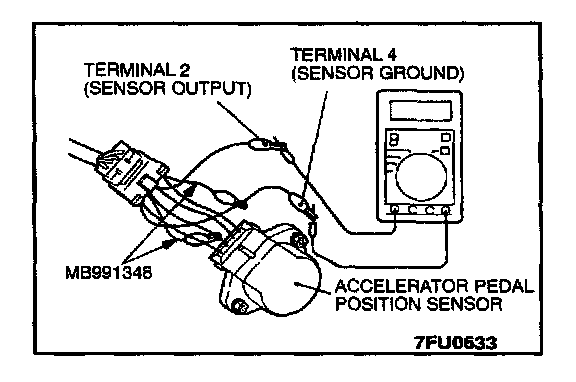 1. Disconnect the accelerator pedal position sensor connector and connect the special tool (test harness: MB991348) in between.