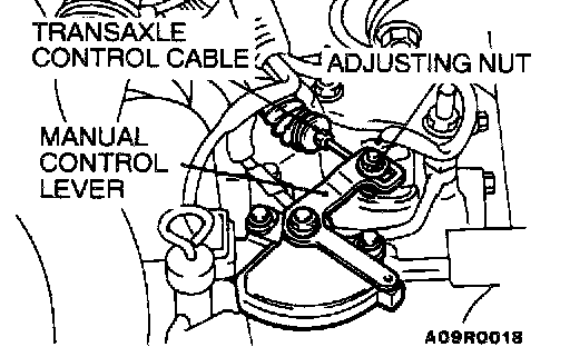 6. Gently pull the transaxle control cable in the direction of the arrow, and then tighten the adjusting nut.