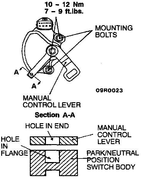 4. Loosen the park/neutral position switch body mounting bolts and turn the park/neutral position switch body so the hole in the end of the manual control lever and the hole (cross section A-A in the figure on the left) in the flange of the park/neutral position switch body flange are aligned.