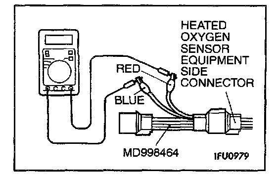 2. Make sure that there is continuity [4.5 - 8.0 Ohms at 20 °C (68 °F)] between terminal 1 (red clip of special tool) and terminal 3 (blue clip of special tool) on the heated oxygen sensor connector.