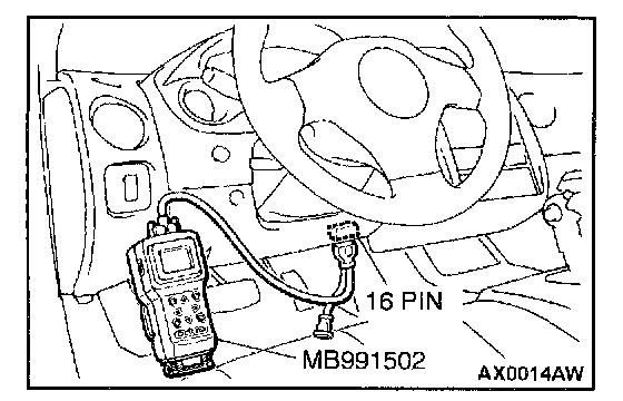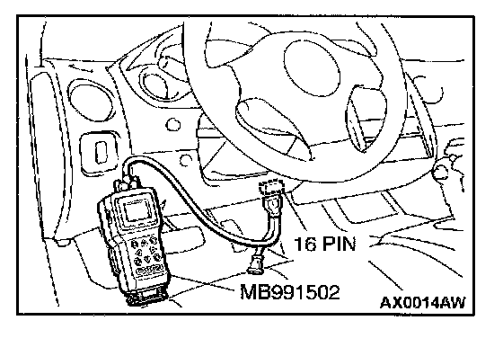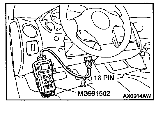CAUTION: To prevent damage to scan tool MB991502, always turn the ignition switch to "LOCK" (OFF) position before connecting or disconnecting scan tool MB991502.