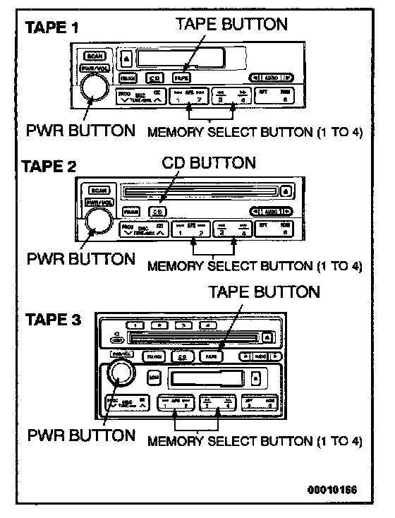 6. Press the "TAPE" button (type 1 and 3) or "CD" button (type 2) button, and a beep will be heard. If entered correctly, the radio and tape player will work.