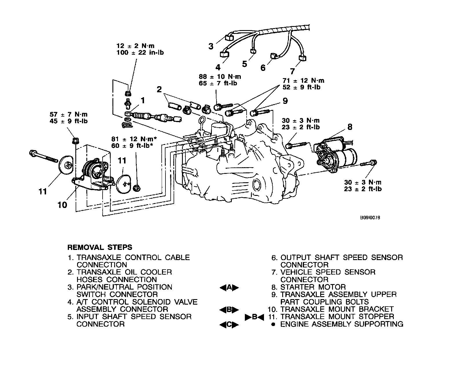 TRANSAXLE ASSEMBLY REPLACEMENT W/ RELATED COMPONENTSCAUTION: *:Indicates parts which should be temporarily tightened, and then fully tightened after placing the vehicle horizontally and loading the full weight of the engine on the vehicle body.