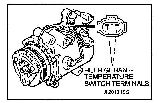 When the A/C is off, check that there is continuity between the refrigerant-temperature switch terminals. If not, replace the switch.