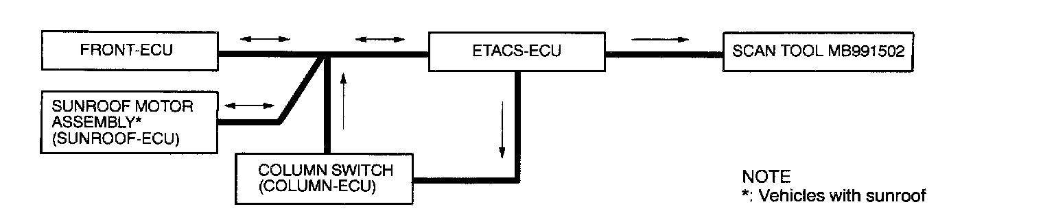 As shown below, signal wires used exclusively for transmitting multiplex signal data connect the ETACS-ECU, front-ECU, column switch (incorporating the column-ECU) and sunroof motor assembly (incorporating the sunroof-ECU) and these components communicate with each other.