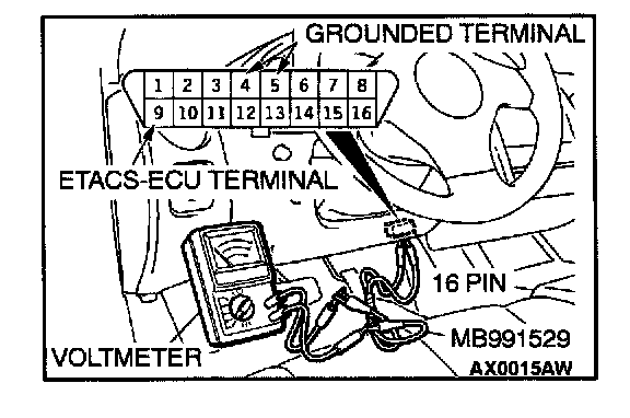 1. Connect special tool MB991529 to connect a voltmeter between grounded terminal 4 or 5 and ETACS-ECU terminal 9 of the 16 pin data link connector.