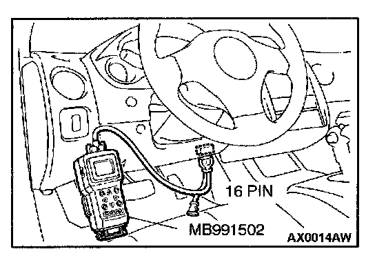 CAUTION: To prevent damage to scan tool MB991502, always turn the ignition switch to "LOCK" (OFF) position before connecting or disconnecting scan tool MB991502.
