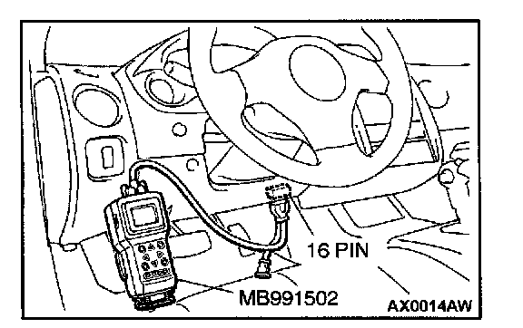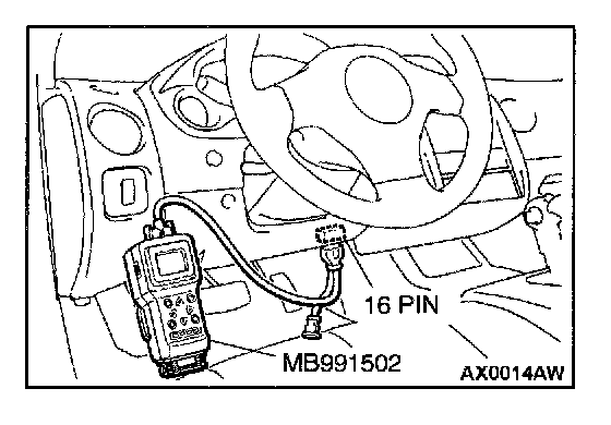 CAUTION: To prevent damage to scan tool MB991502, always turn the ignition switch to "LOCK" (OFF) position before connecting or disconnecting scan tool MB991502.