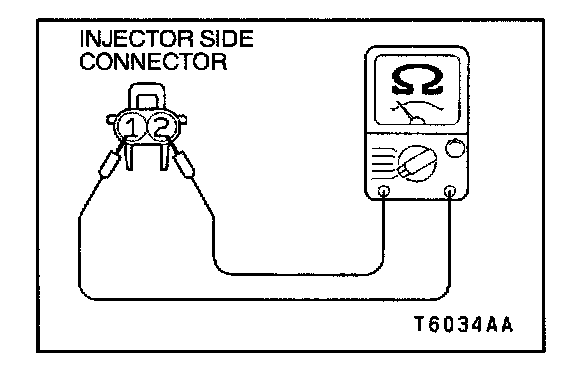 3. Measure the resistance between injector side connector terminals 1 and 2.
