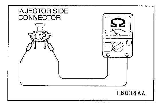 2. Measure the resistance between each injector side connector terminals 1 and 2.