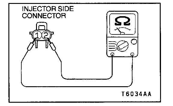 2. Measure the resistance between each injector side connector terminals 1 and 2.