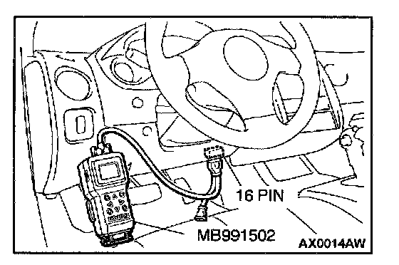 CAUTION: To prevent damage to scan tool MB991502, always turn the ignition switch to "LOCK" (OFF) position before connecting or disconnecting scan tool MB991502.