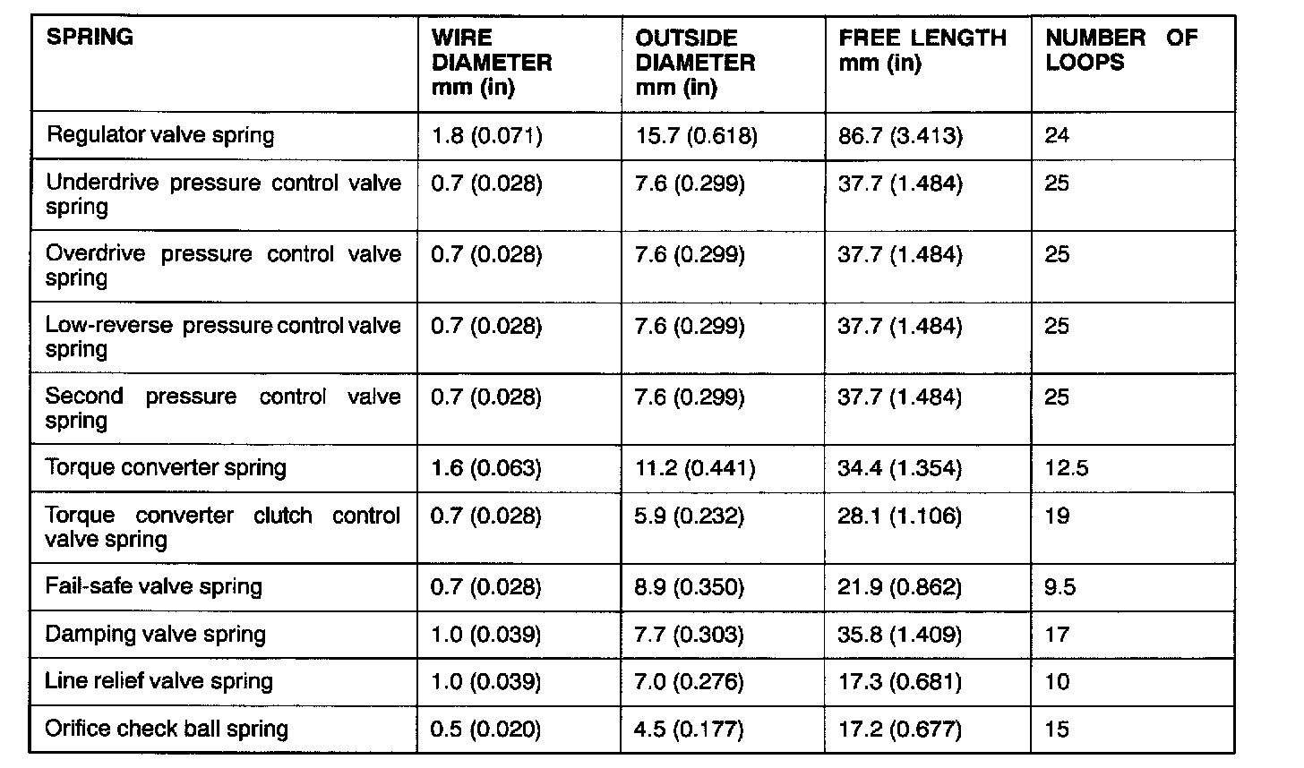 VALVE BODY SPRING IDENTIFICATION TABLE