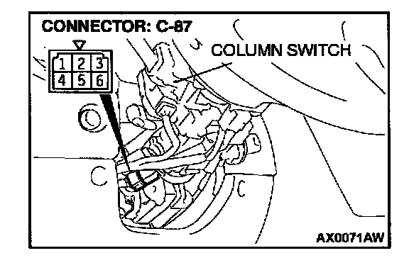 Disconnect ignition switch connector C-87 without removing the ignition switch and steering lock cylinder. Then check the continuity.