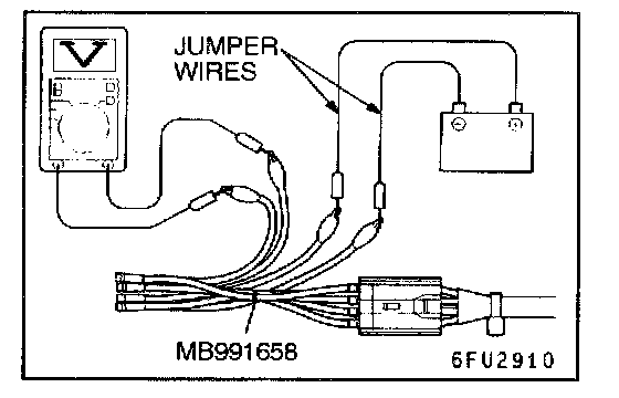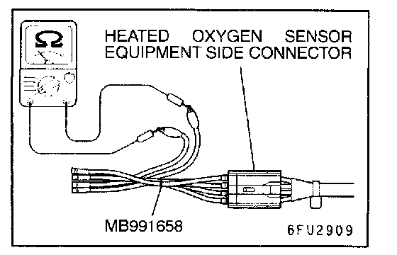 1. Disconnect the heated oxygen sensor connector and connect special tool MB991658 to the connector on the heated oxygen sensor side.