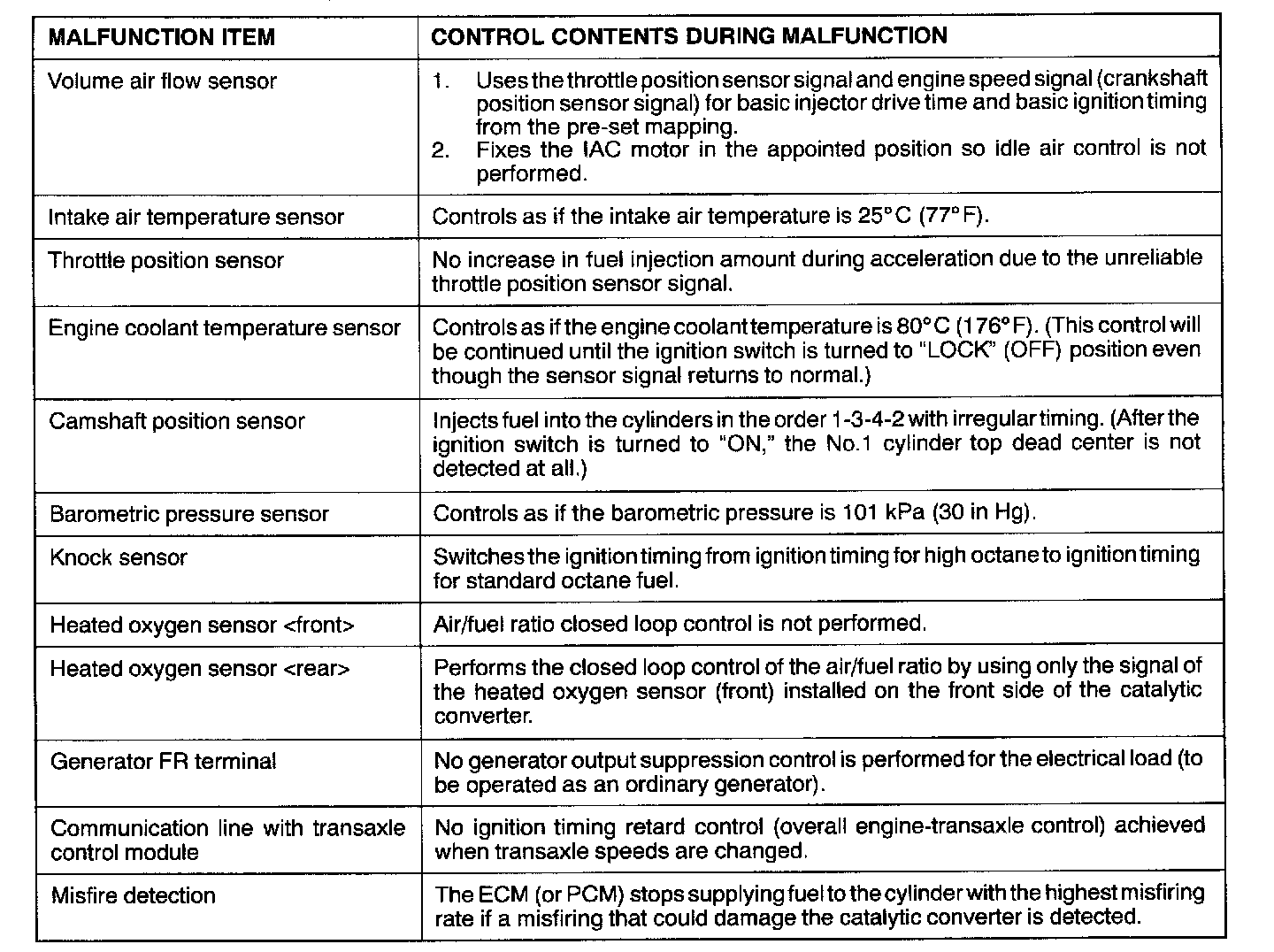 When the main sensor malfunctions are detected by the diagnostic test mode, the vehicle is controlled by means of the following defaults.