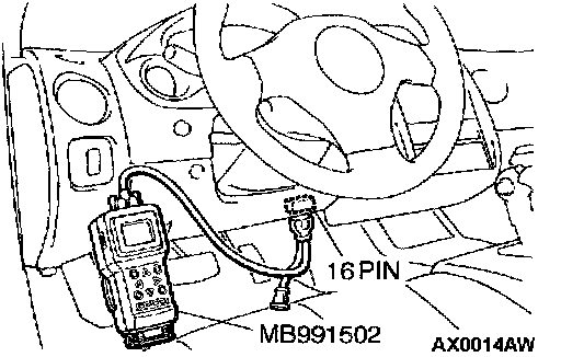 CAUTION: To prevent damage to scan tool MB991502, always turn the ignition switch to "LOCK" (OFF) position before connecting or disconnecting scan tool MB991502.