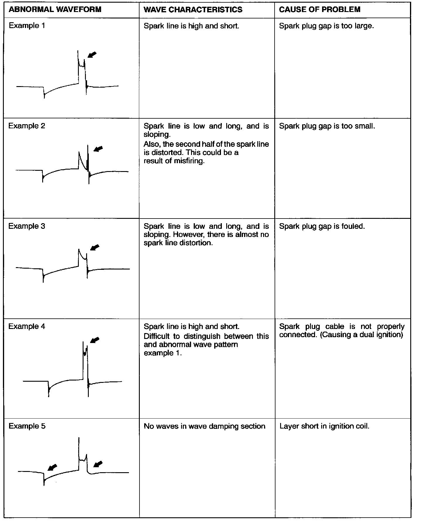 The height, length and slope of the spark line (refer to abnormal waveform examples 1, 2, 3 and 4) show the following trends.