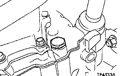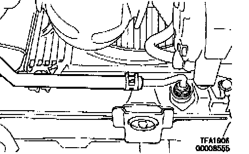 1. Disconnect the hose shown in the illustration which connects the transaxle and the oil cooler (inside the radiator). Place a container under the hose to collect the discharge.