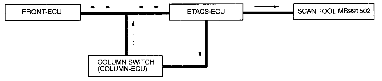 As shown below, signal wires used exclusively for transmitting multiplex signal data connect the ETACS-ECU, front-ECU and column switch (incorporating the column-ECU) and these components communicate with each other.