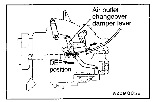 2. Set the air outlet changeover damper lever of the heater unit to the DEF position as shown in the illustration, and then connect the cable to the lever pin.
