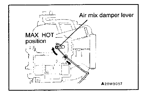 2. Set the air mix damper lever of the heater unit to the MAX HOT position as shown in the illustration, and then connect the cable to the lever pin.