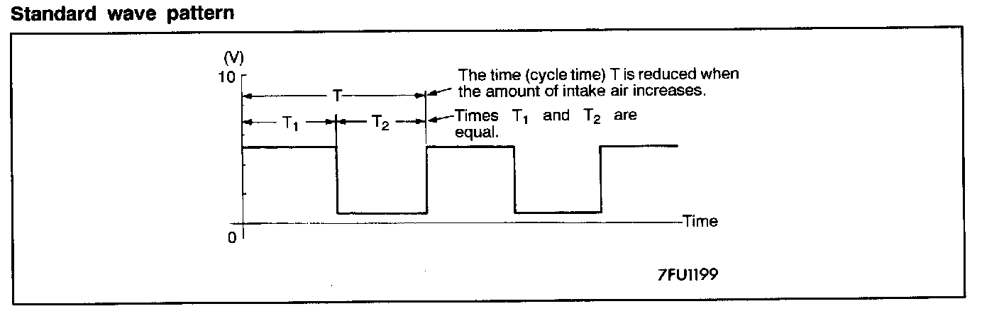 Unstable wave pattern with non-uniform frequency. However, when an ignition leak occurs during acceleration, the wave pattern will be distorted temporarily, even if the volume air flow sensor is normal.