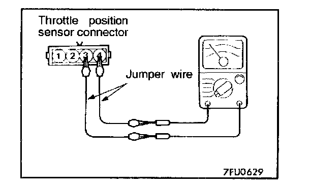 2. Connect a digital voltmeter between the throttle position sensor terminal 2 (sensor output) and terminal 4 (sensor ground.)