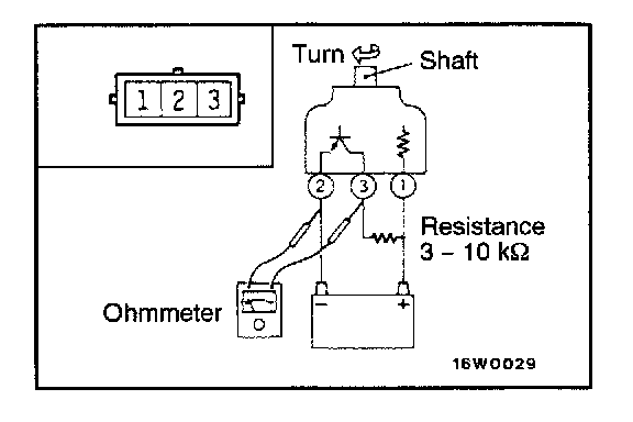 VEHICLE SPEED SENSOR CHECK1. Remove the vehicle speed sensor and connect a 3 - 10 kOhms resistance as shown in the illustration.