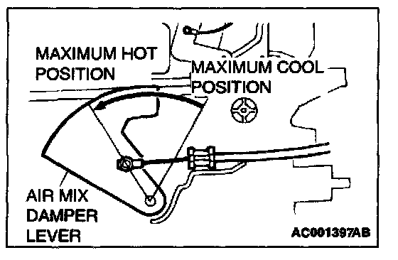 2. Set the air mix damper lever of the heater/cooler unit to the maximum hot position as shown in the illustration, and then connect the cable to the lever pin.