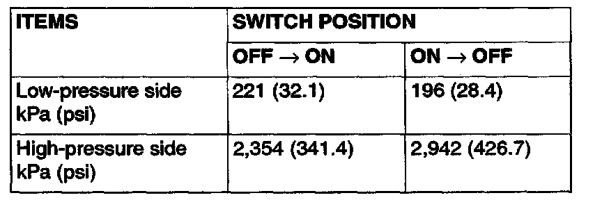 3. When the high/low pressure sides of the dual pressure switch are at operation pressure (ON) and there is continuity between the respective terminals, then the condition is normal. If there is no continuity, replace the switch.