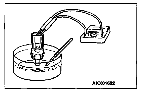 2. With the temperature sensing portion of engine coolant temperature sensor immersed in hot water, check the resistance.