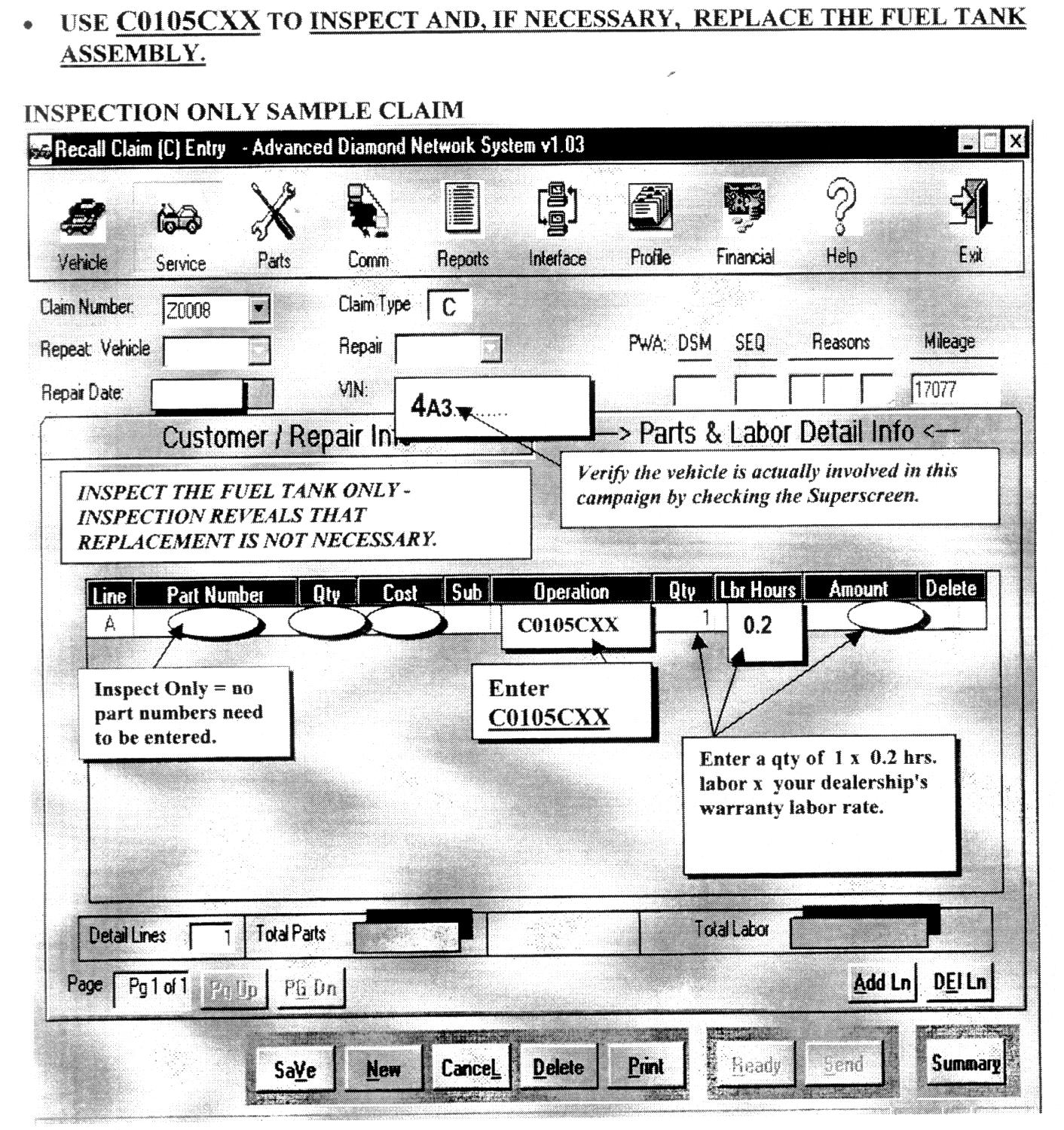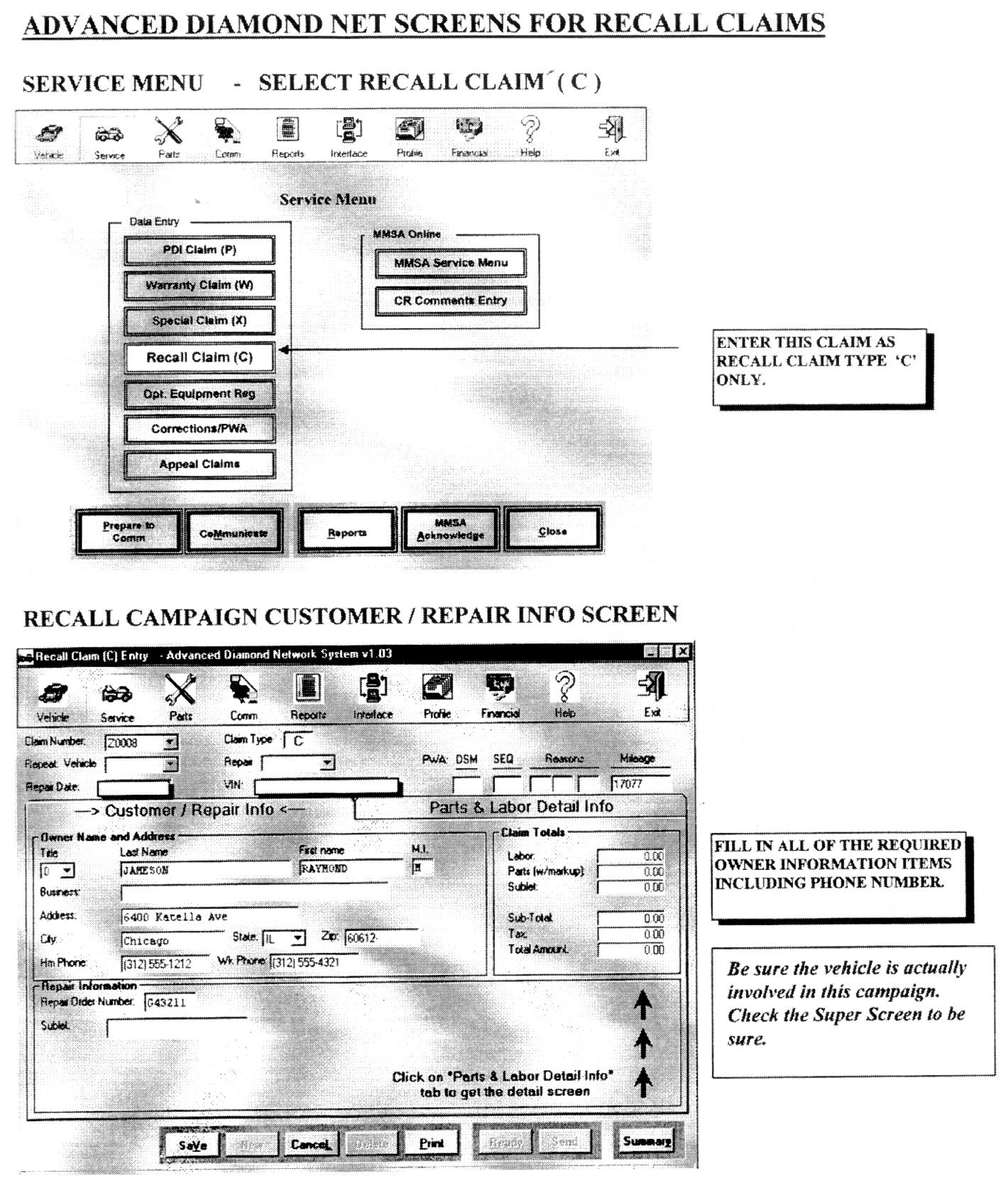 Claims for this campaign must be entered as Recall type "C" claims on your Diamond Network Service Menu. Sample claim screens are shown in this bulletin.