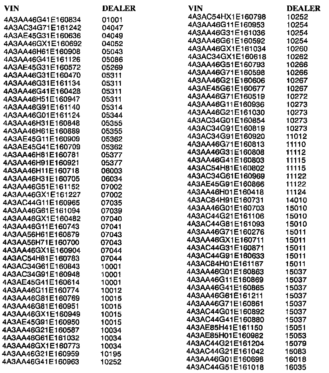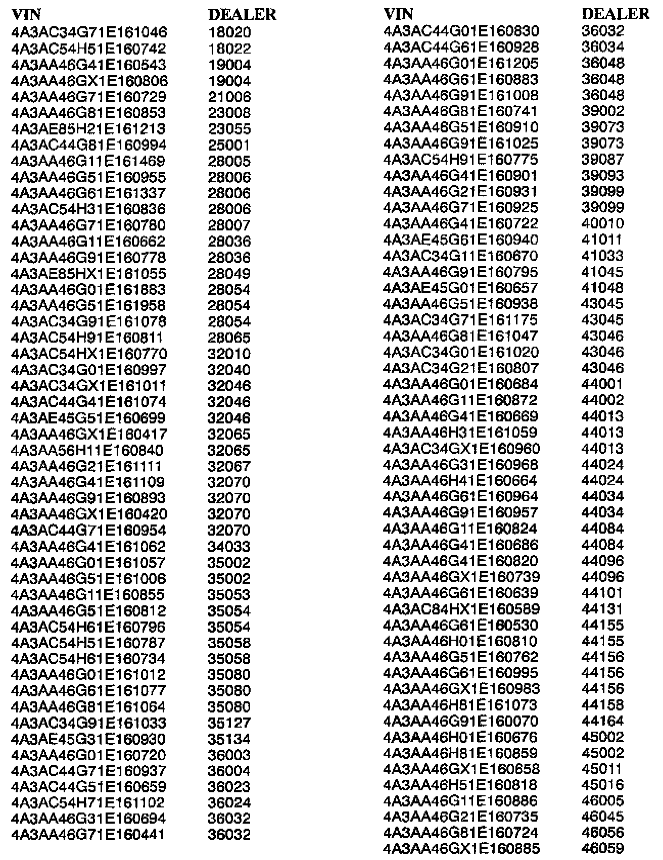 AFFECTED VEHICLES - SAFETY RECALL CAMPAIGN SR-01-006 (Last 8 numbers of VIN listed in order by dealer code)
