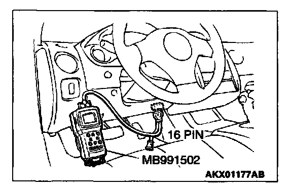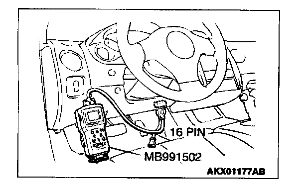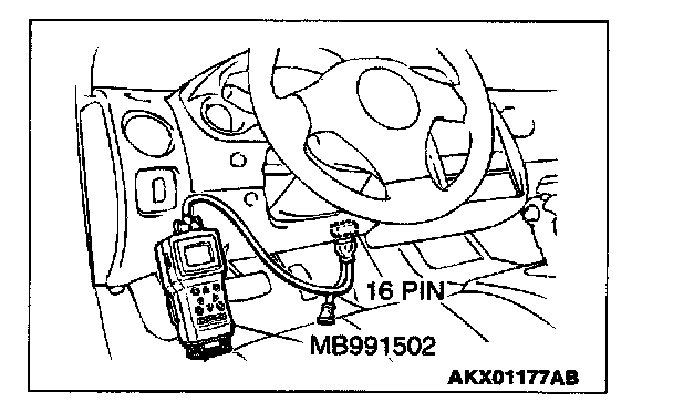CAUTION: To prevent damage to scan tool MB991502, always turn the ignition switch to the "LOCK" (OFF) position before connecting or disconnecting scan tool MB991502.
