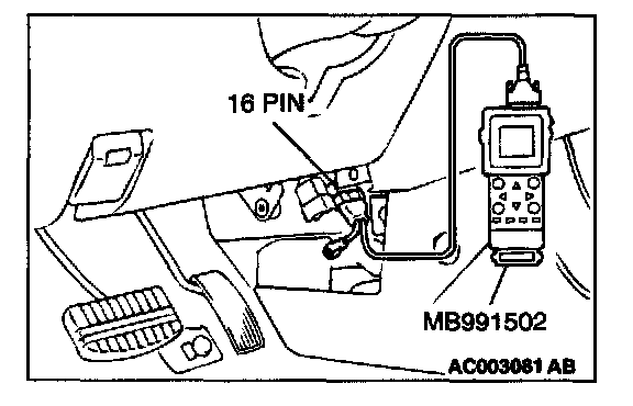CAUTION: To prevent damage to scan tool MB991502, always turn the ignition switch to the "LOCK" (OFF) position before connecting or disconnecting scan tool MB991502.