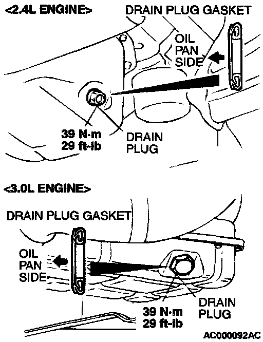 4. Install a new drain plug gasket so that it faces in the direction shown in the illustration, and then tighten the drain plug to the specified torque.